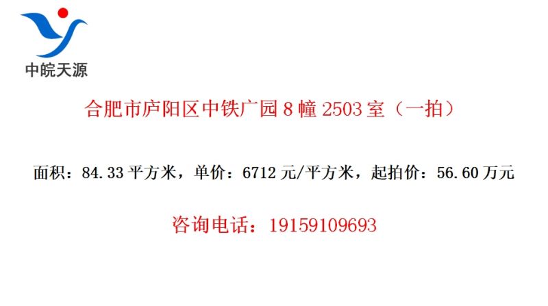 合肥市庐阳区中铁广园8幢2503室(一拍)