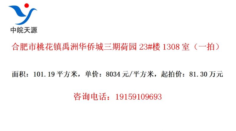 合肥市桃花镇禹洲华侨城三期荷园23#楼1308室(一拍)
