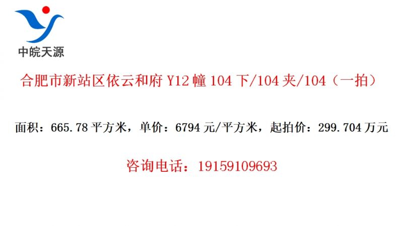 合肥市新站区涣水路699号依云和府Y12幢104下/104夹/104【不动产权证号:皖(2022)合肥市不动产权第2035378号】房产;建筑面积:665.78平方米;所在层/总层数:-1-1/12层;规划用途:住宅;房屋性质:市场化商品房;宗地性质:出让;登记时间:2022-10-13(其中104夹为夹层,用途为储藏,建筑面积为331.52平方米;104下为-1层,用途为储藏,建筑面积为219.25平方米)。