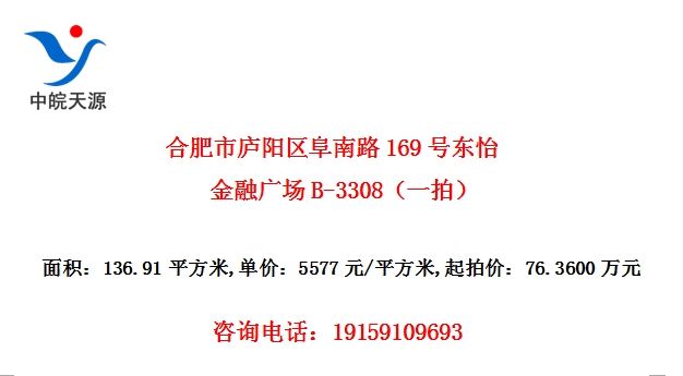 合肥市庐阳区阜南路169号东怡金融广场B-3308(一拍)