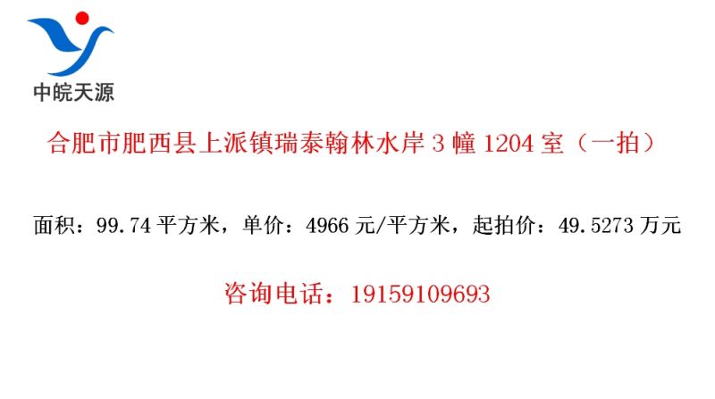 合肥市肥西县上派镇瑞泰翰林水岸3幢1204室(一拍)