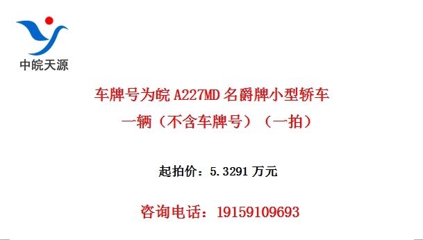 车牌号为皖A227MD名爵牌小型轿车一辆(不含车牌号)(一拍)