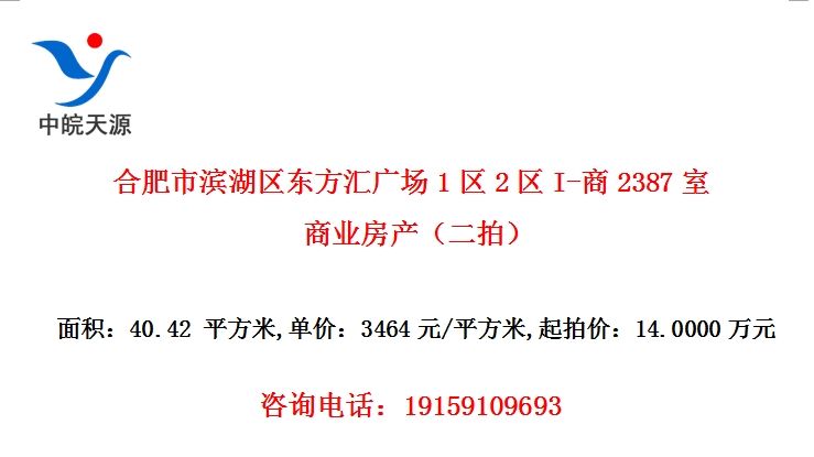 合肥市滨湖区东方汇广场1区2区I-商2387室商业房产(二拍)
