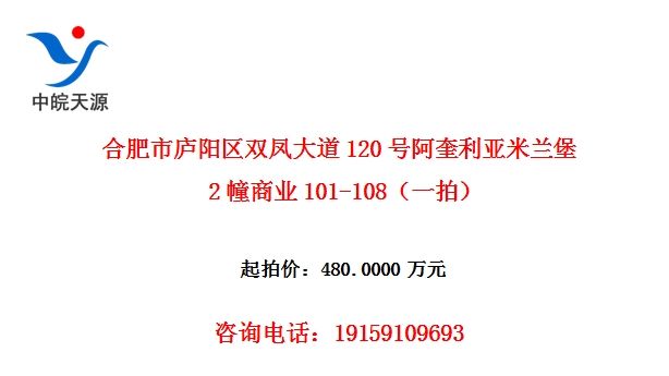 合肥市庐阳区双凤大道120号阿奎利亚米兰堡2幢商业101至108室 【不动产证书号 :房权证合产字第8110118880号 ;建筑面积 :101室94.39㎡、102室107.93㎡ 、103室101.44㎡、104室107.93㎡、105室107.93㎡、106室101.44㎡、107室107.93㎡、108室94.39㎡;总层数 :6 ;所在层 :1 ;规划用途 :商业服务 ;房屋性质 :市场化商品房 ;宗地性质:出让 ;登记时间:2014年1月7日】