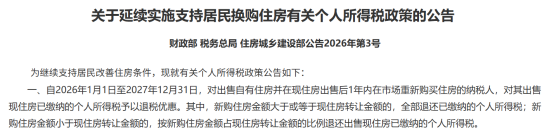 居民换房退个税政策续期至2027年底! 1月14日,财政部、税务总局、住房和城乡建设部(下称“三部门”)联合发布公告,宣布自2026年1月1日至2027年12月31日,延续实施支持居民换购住房有关个人所得税政策。对出售自有住房并在现住房出售后1年内在市场重新购买住房的纳税人,对其出售现住房已缴纳的个税予以退税优惠。 居民换房退个税政策自2022年9月由财政部、税务总局出台,经过2023年三部门发文续期后,持续实施至2025年底。本次三部门再次发布续期公告,将政策期限进一步延续至2027年底。 在具体退税细则上,公告明确,新购住房金额大于或等于现住房转让金额的,全部退还已缴纳的个税;新购住房金额小于现住房转让金额的,按新购住房金额占现住房转让金额的比例退还出售现住房已缴纳的个税。 公告规定,现住房转让金额为该房屋转让的市场成交价格。新购住房为新房的,购房金额为纳税人在住房城乡建设部门网签备案的购房合同中注明的成交价格;新购住房为二手房的,购房金额为房屋的成交价格。 我国长期以来实施个人转让家庭生活用房个税“满五唯一”免征政策,即对个人转让自用5年以上,并且是家庭唯一生活用房取得的所得,免征个税。此次续期的居民换房个税退税政策,或将带动更多持有住房未满5年或有多套房的家庭换房,提升二手房市场交易活跃度。 中指研究院指出,居民换房退个税政策续期,既彰显政策连续性,有利于稳定市场预期,也将继续降低换房家庭的购房成本,有助于促进改善性住房需求释放。 从下调个人销售未满2年住房增值税,到本次居民换房退个税政策续期,近期稳楼市支持政策主要聚焦于降低楼市交易成本。广东省城乡规划设计研究院住房政策研究中心首席研究员李宇嘉向证券时报记者指出,近期多地二手房市场交易价格中枢仍在走低,居民住房“卖一买一”置换循环受阻。从近期央地施策来看,降低楼市交易成本或是2026年稳楼市政策的确定性方向。 |
