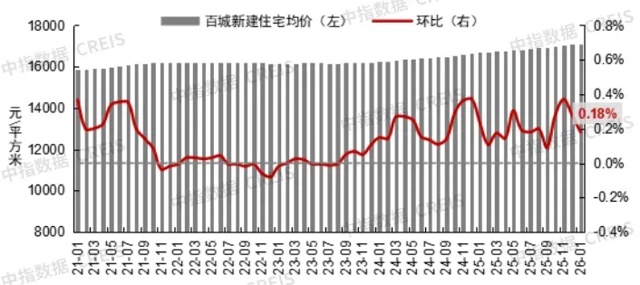 “2026年1月城市典型样本项目”多为各区域内具有代表性的优质项目,不仅契合区域发展特征,更在产品理念、空间营造、绿色健康、智能科技等方面体现出当前住宅发展的主流趋势与创新方向。 1月百城新建住宅价格及环比涨跌幅