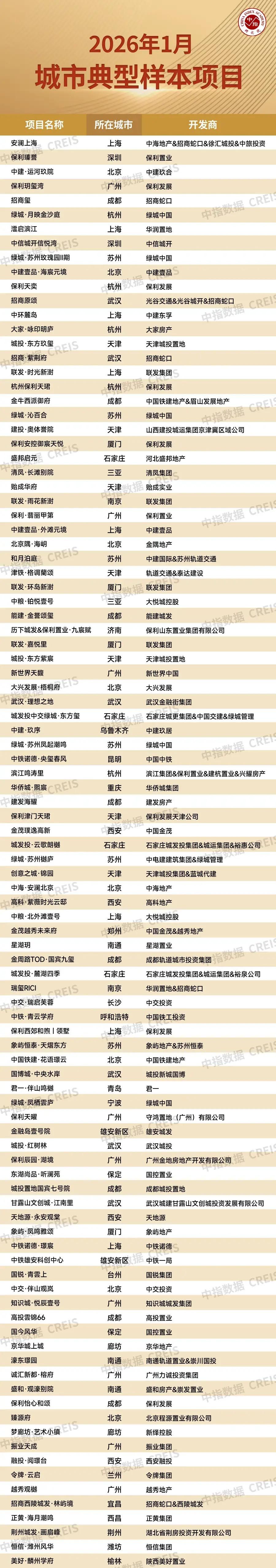 市场进入以“稳定预期、缩短调整时间”为目标的新阶段 政策方面,1月1日,《求是》杂志刊发《改善和稳定房地产市场预期》特约评论员文章,强调“加强预期管理对稳定房地产市场具有特殊重要性”,并提出要“尽可能缩短调整时间,熨平市场波动”,“政策要一次性给足,不能采取添油战术”。14日,财政部、税务总局、住建部发布公告,将换房退个税政策适用期延长至2027年末。15日,央行下调结构性货币政策工具利率,并将商业用房最低首付比例降至30%。20日,自然资源部、住建部联合印发《进一步支持城市更新行动若干措施的通知》,围绕增强详细规划适应性、优化过渡期支持政策、推进存量土地和空间的临时利用、鼓励资源资产组合供应整体运营、创新不动产登记服务及妥善处置历史遗留问题等六方面进一步支持城市更新措施落地。同时,市场消息证实,本月监管部门对房地产融资协调机制下发了最新的政策指导,对已进入融资协调机制“白名单”的项目,符合一定条件和标准的,可在原贷款银行进行展期,即相关贷款可展期5年。此外,近期据媒体报道,多家房企已不再被要求每月向监管部门上报“三道红线”指标,仅部分出险房企需定期汇报资产负债率等核心财务数据。 地方层面,北京采取正负面清单方式明确各类用地允许、禁止兼容内容和比例要求;上海支持商务楼宇更新,允许存量商务楼宇兼容租赁住房(含人才公寓)、酒店、文娱、医疗健康等功能;武汉、沈阳、厦门等地优化公积金贷款政策;南京、银川等发放购房补贴。另外,1月四川、浙江发行约105亿元专项债券收回收购闲置存量土地。 整体来看,进入2026年,政策层面释放出清晰的“稳预期”信号,年初已有多项具体措施落地,包括换房退税政策延长、白名单项目贷款展期及结构性降息、支持城市更新等,旨在从需求端与融资端协同发力,提振市场信心。整体来看,房地产政策已进入以“稳定预期、缩短调整时间”为目标的新阶段。市场方面,2月份受春节假期影响,楼市销售节奏或将阶段性放缓。但展望后市,随着核心城市2025年出让的优质地块逐渐入市,加之部分房企预计在春节前加大促销力度提前蓄客,3月市场需求有望逐步释放,核心城市“小阳春”行情依然值得期待。 城市典型样本项目 近期,住建部发布《关于提升住房品质的意见》,明确面向2030年的住房品质发展目标与重点任务,提出要加大安全、舒适、绿色、智慧的“好房子”供给力度,为构建房地产发展新模式筑牢坚实支撑。在此背景下,中指研究院在中房指数系统理论体系和架构的基础上,从百城价格指数样本项目中选取城市中有较强知名度和广泛影响力的项目,以“典型性”为基本原则,从销售表现、项目品质、品牌实力等维度出发,对主要城市样本项目进行研究,得出“2026年1月城市典型样本项目”,为行业提供标杆典范。