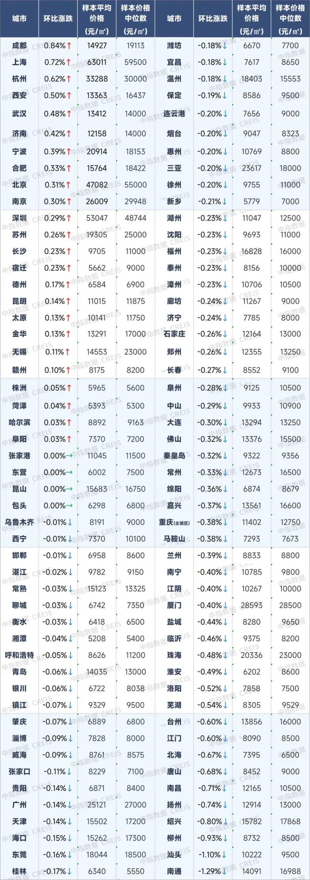 图:百城二手住宅价格及环比变化