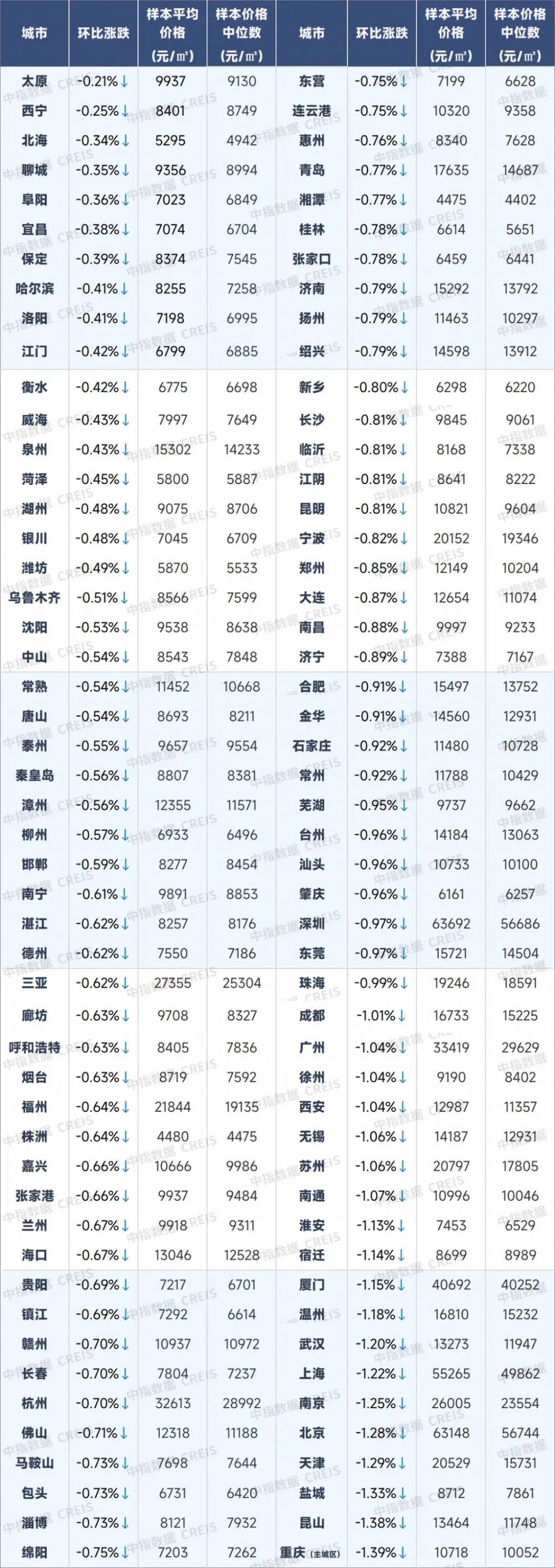 1月百城二手住宅价格及环比涨跌幅