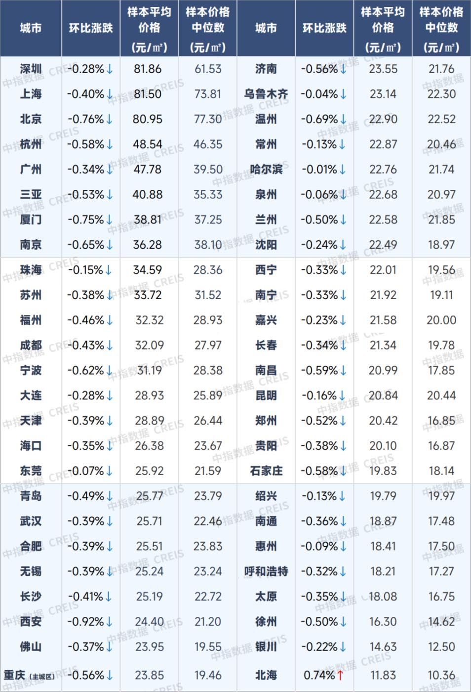 图:50城住宅平均租金及环比变化