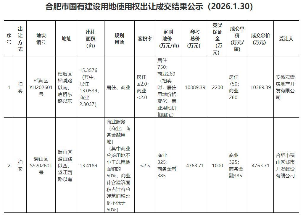 2月2日,合肥2026年首场土拍落幕,瑶海区YH202601号商住地块与蜀山区SS202601号商业用地成功出让,总成交额约1.52亿元。其中,瑶海地块的竞得标志着和平片区城市更新项目全面启动,为合肥主城焕新按下“加速键”。