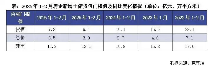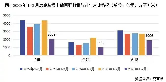 典型100家企业拿地金额2059亿元 2026年前两月,受到地方政府供地尚未开启及春节假期的影响,多数规模房企并未开启投资铺排,因此典型企业拿地货值、金额、面积均出现同比下降。 其中,新增土储百强房企的新增货值、总价和建面百强之和分别为2059亿元、996亿元和1906万平方米,货值、金额降幅近五成,面积较同期下降29%。 值得注意的是,目前房企投资筑底阶段,但核心城市优质地块仍是必争之地。以广州马场地块来看,共计8家房企参拍,其中包括越秀、保利、中海、华润、招商等多家头部央国企,竞争十分激烈,百轮竞拍之后,仍有5家房企持续角逐。最终越秀地产以236亿、溢价26.6%获得,该地块成交总价排名广州第二、跻身全国第五,住宅可售楼面单价跻身全国前十。